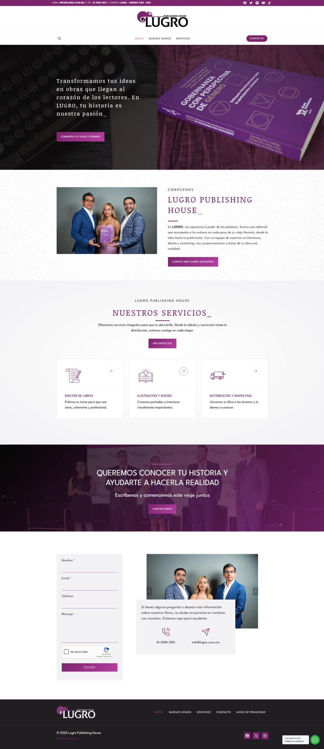 Lugro Publishing House es un sitio web diseñado con un estilo claro y profesional. La navegación resulta sencilla y agradable, permitiendo que el visitante se mueva con fluidez entre las secciones principales. Desde la presentación de la empresa hasta los apartados de servicios — todo está organizado de manera lógica, terminando con un formulario de contacto accesible que facilita la comunicación directa.